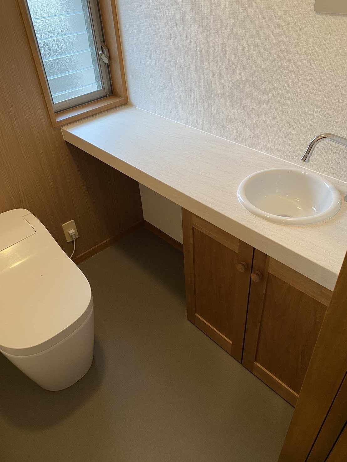 配管が見えて収納のないトイレ手洗いカウンターを造作でリノベーション。扉付きなので配管も隠れ収納力もUPしました。カウンター天板は大理石調のアイカメラミンカウンターでお手入れも楽になりました。