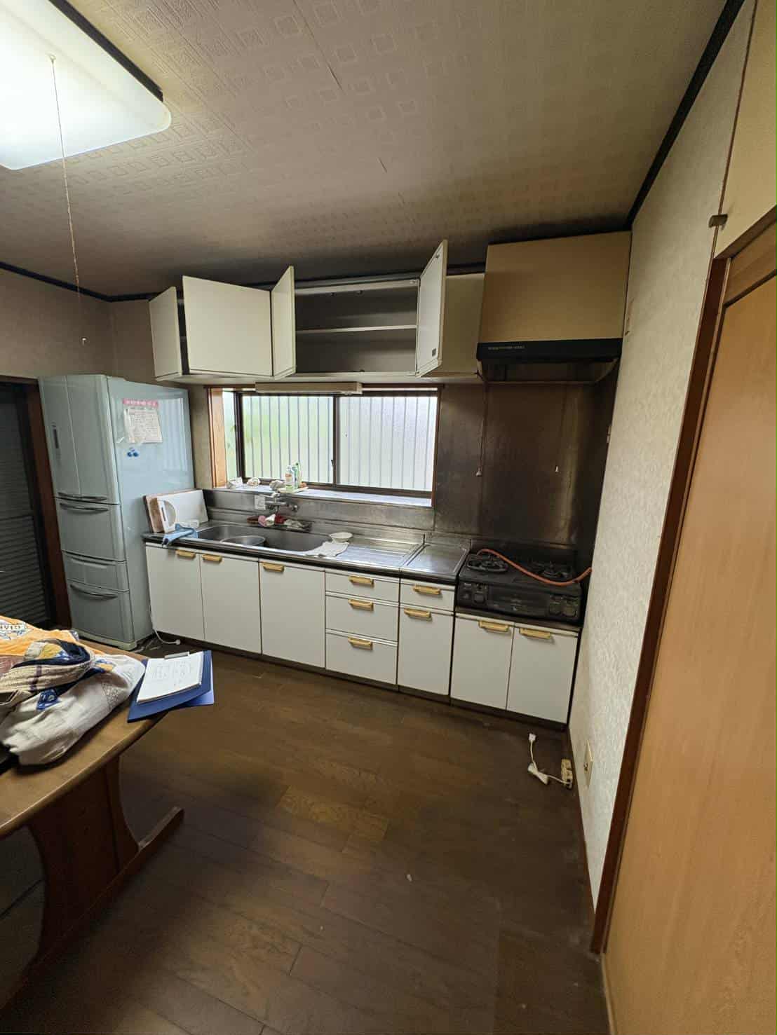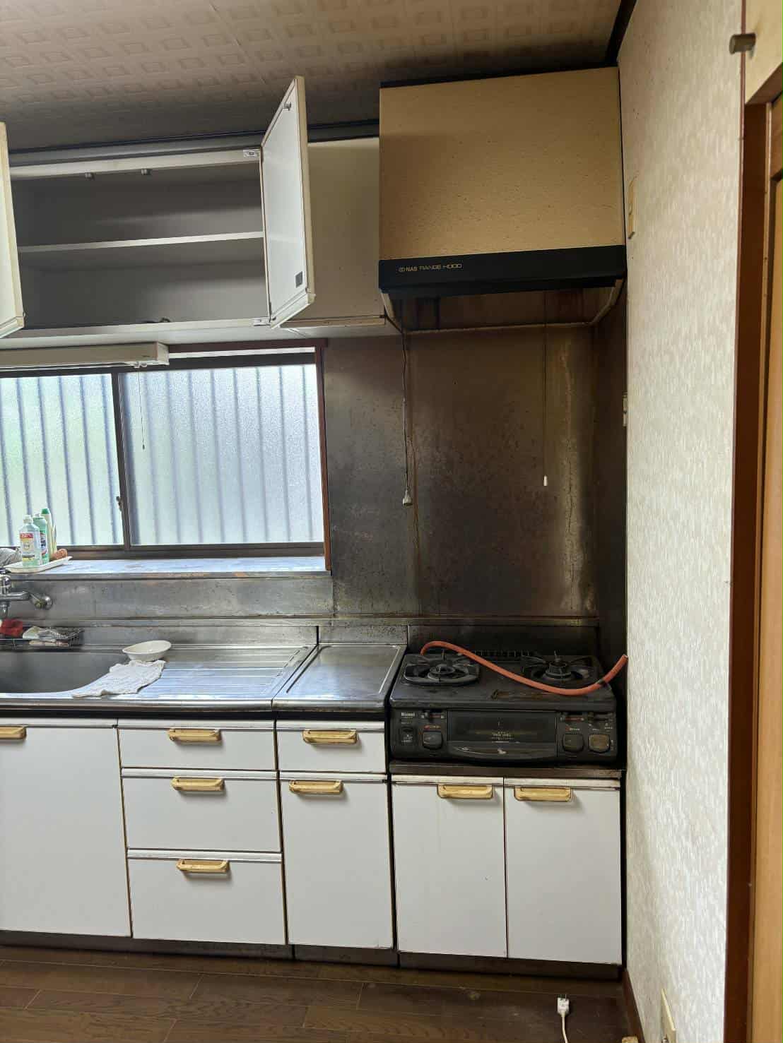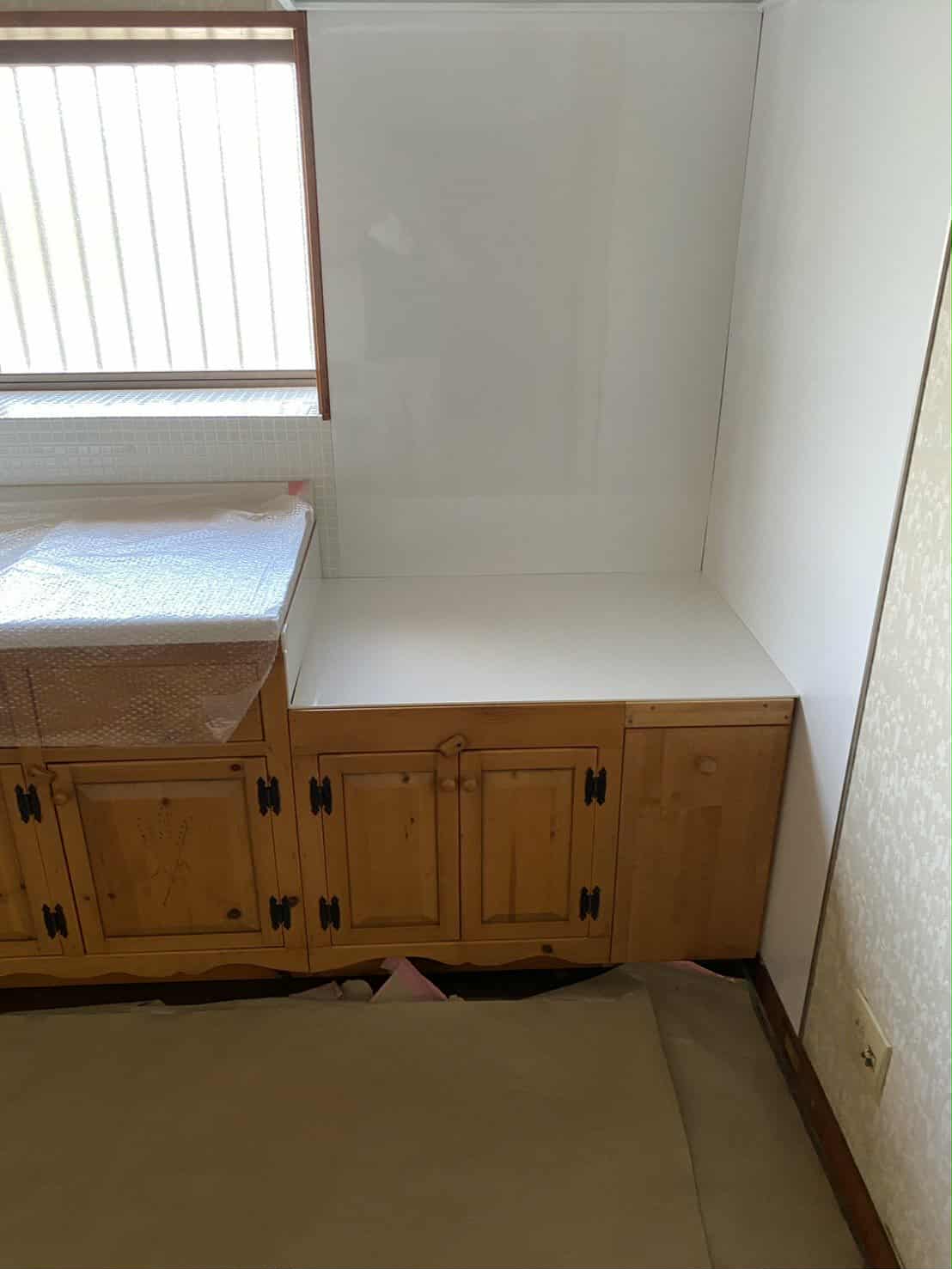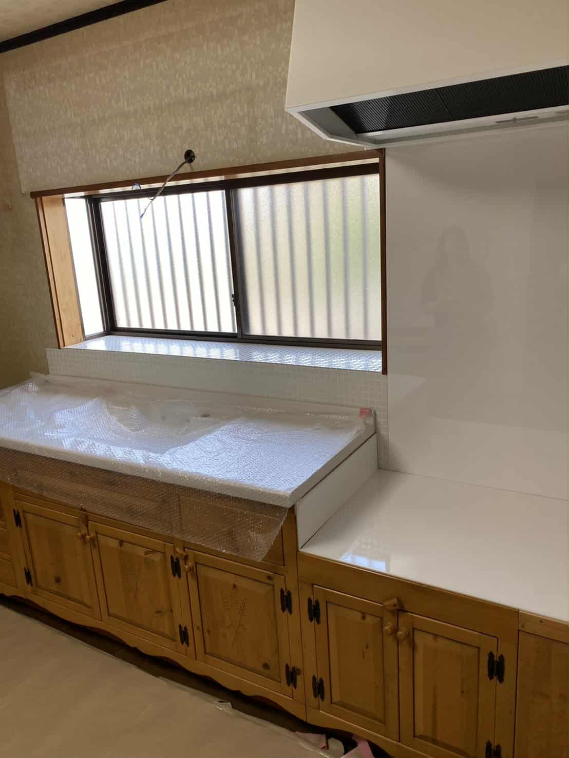 既存のシステムキッチンを撤去し、カントリーキッチンを設置しました。天板は人工大理石で作り直し、窓枠まわりは白いタイルを貼って艶感を足しました。